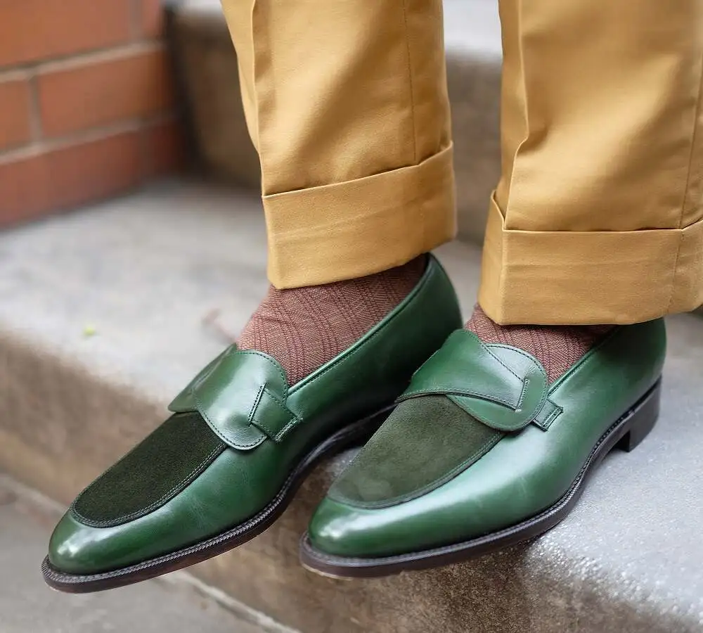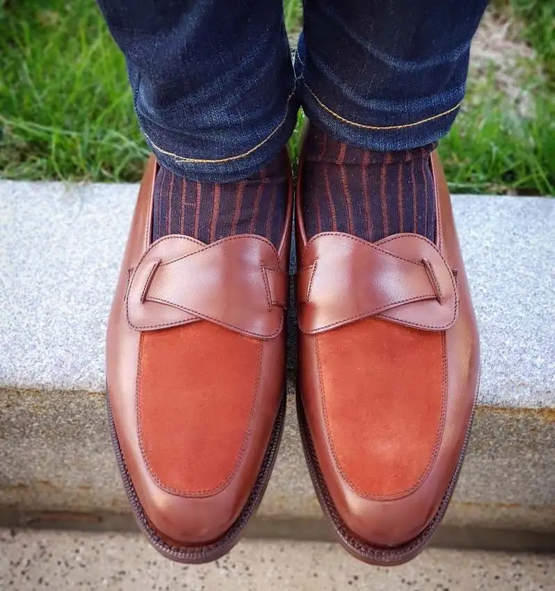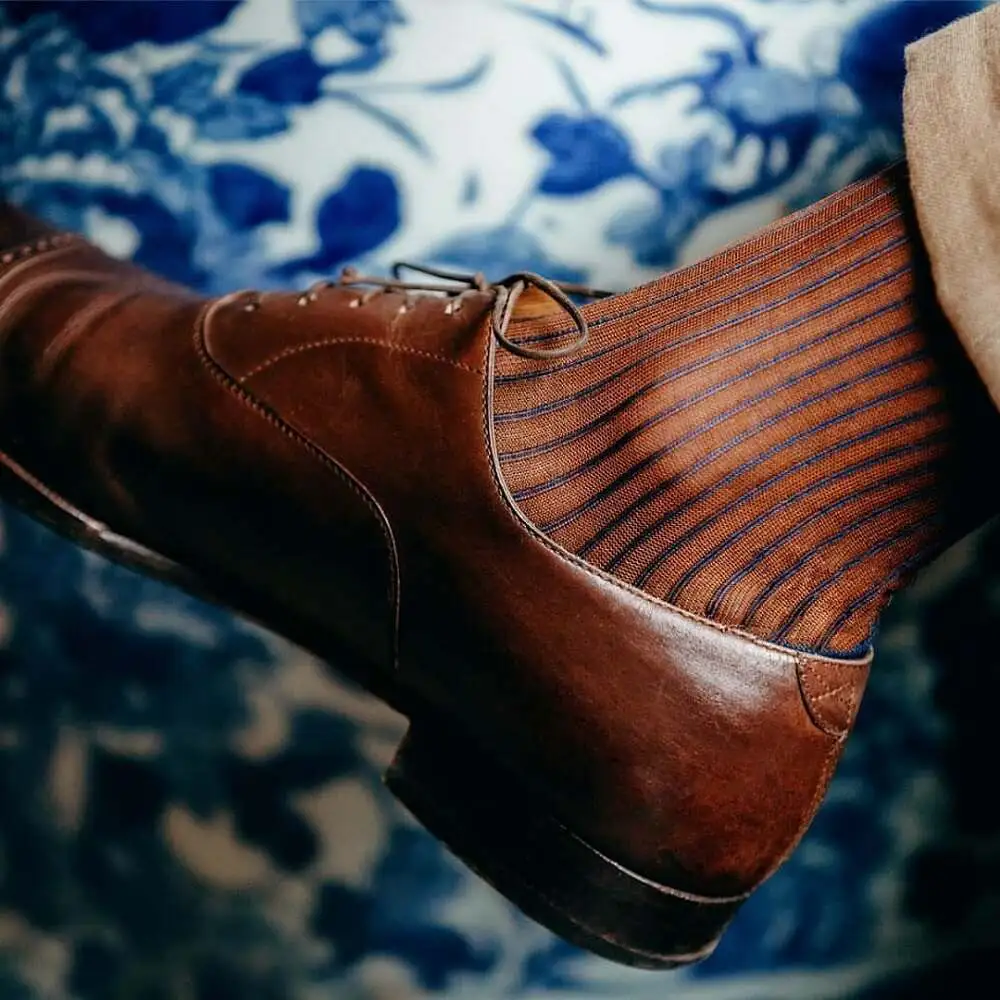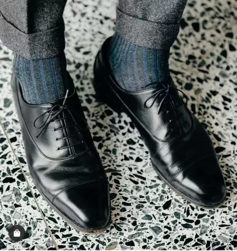 - Contrasting: This is for the bold whereby you wear a sock that is neither matching your shoes nor your trousers but is contrasting in a complementary nature in tone to both your shoes and your trousers. The last picture, at the very bottom, represents this idea very well.