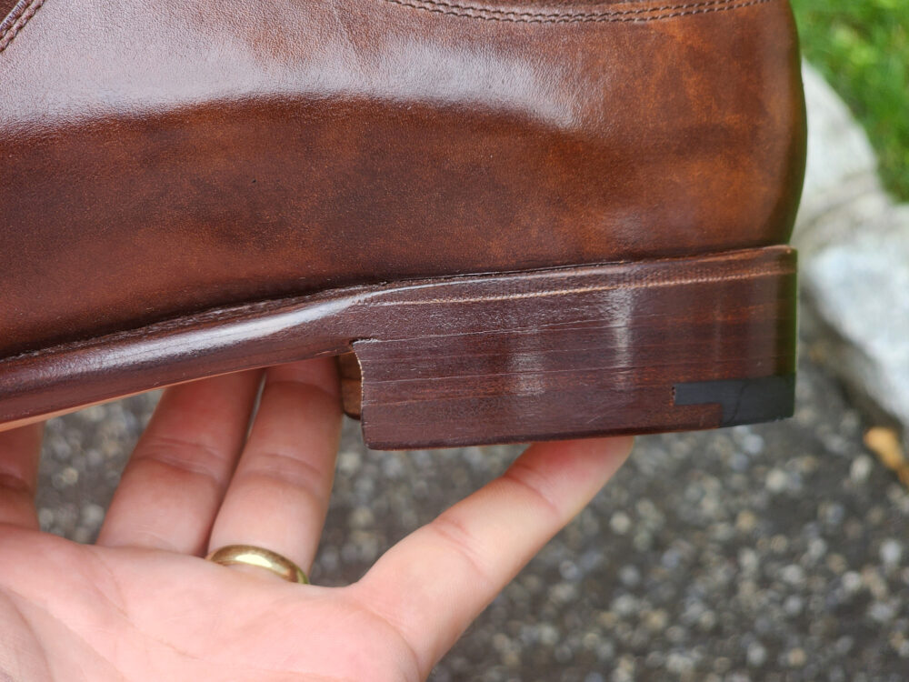 I don’t really look at flaws like I used to, in all honesty. Not because I don’t think that they do not exist but think that you are looking for one, you will find it outside of shoes that are 100% bespoke and cost upward of $5,000. But for the sake of showing you how you can always find something if you look for it, which will most likely be inconsequential, the only thing I noticed was a heel joining. It was not 100% flawless, but in reality is nothing of importance. But I do know that some people like to complain about it, so there you go.