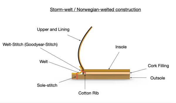 Storm welt is a variation of Goodyear construction that adds a raised lip or flap of leather running along the perimeter of the shoe, where the upper meets the sole. It’s designed to provide extra water resistance and protection from the elements.
