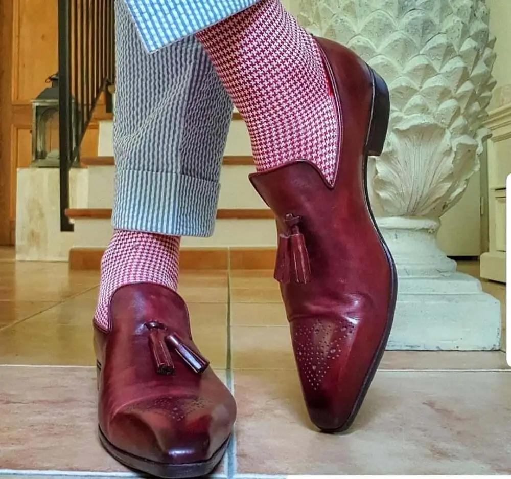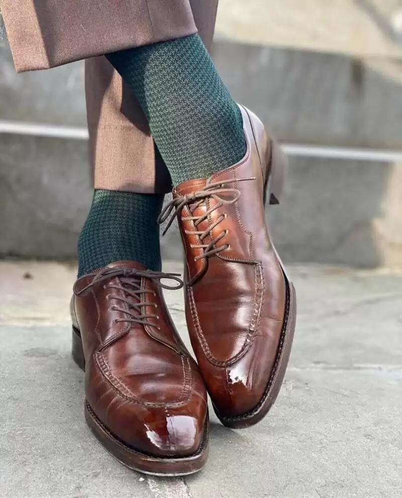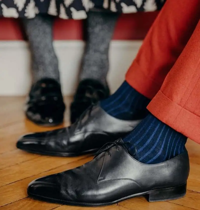 - Contrasting: This is for the bold whereby you wear a sock that is neither matching your shoes nor your trousers but is contrasting in a complementary nature in tone to both your shoes and your trousers. The last picture, at the very bottom, represents this idea very well.