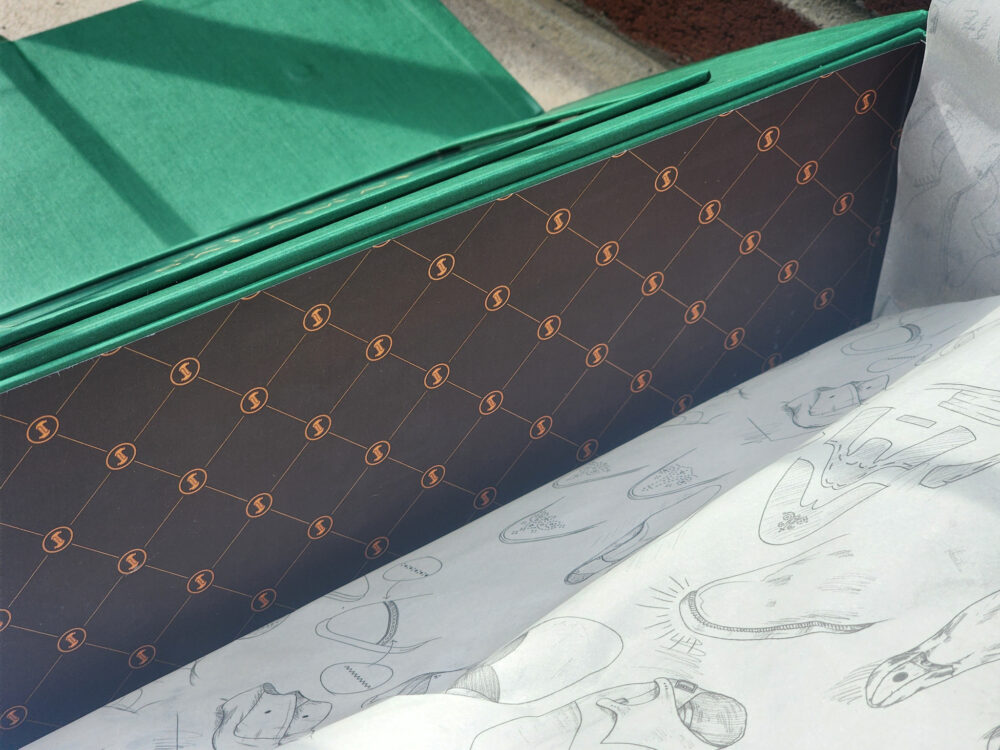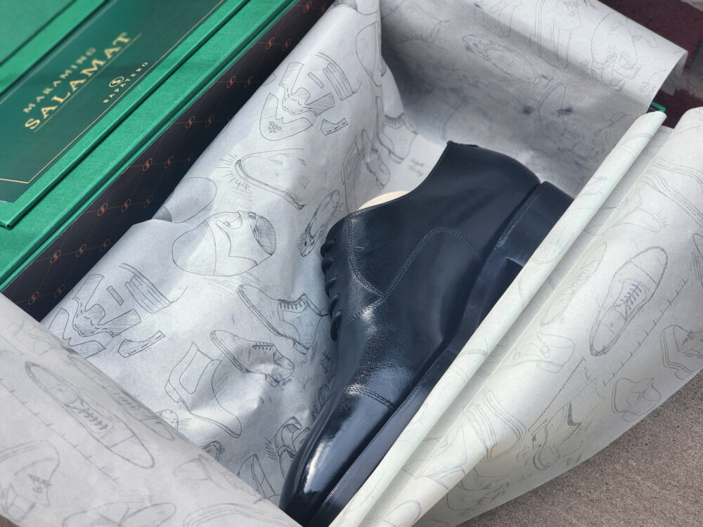 Sapatero impressed me immediately with their presentation. The box is sturdy and lined with a quilted pattern, featuring the brand’s clever hammer logo — a subtle nod to the craft of shoemaking while tying it into their name as the hammers created an ‘S’. Even the wrapping paper is printed with shoe design sketches, something I’ll always appreciate as a designer myself. A shoe care guide card is also included, which is a thoughtful touch for clients.